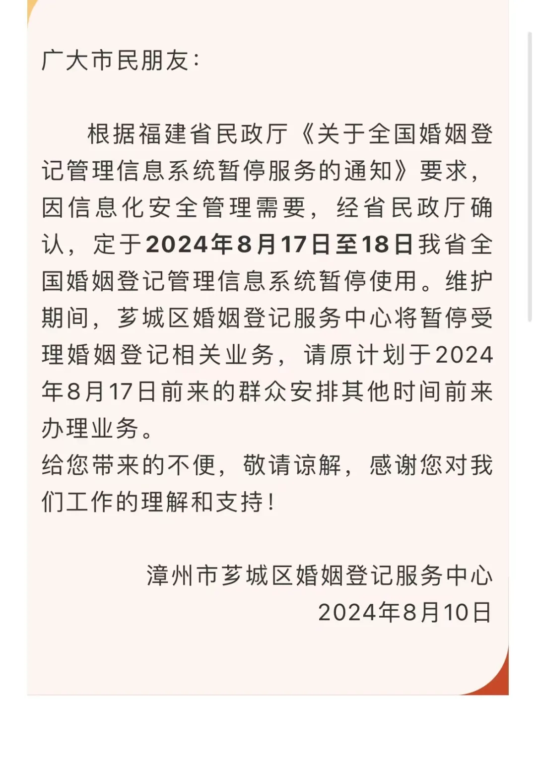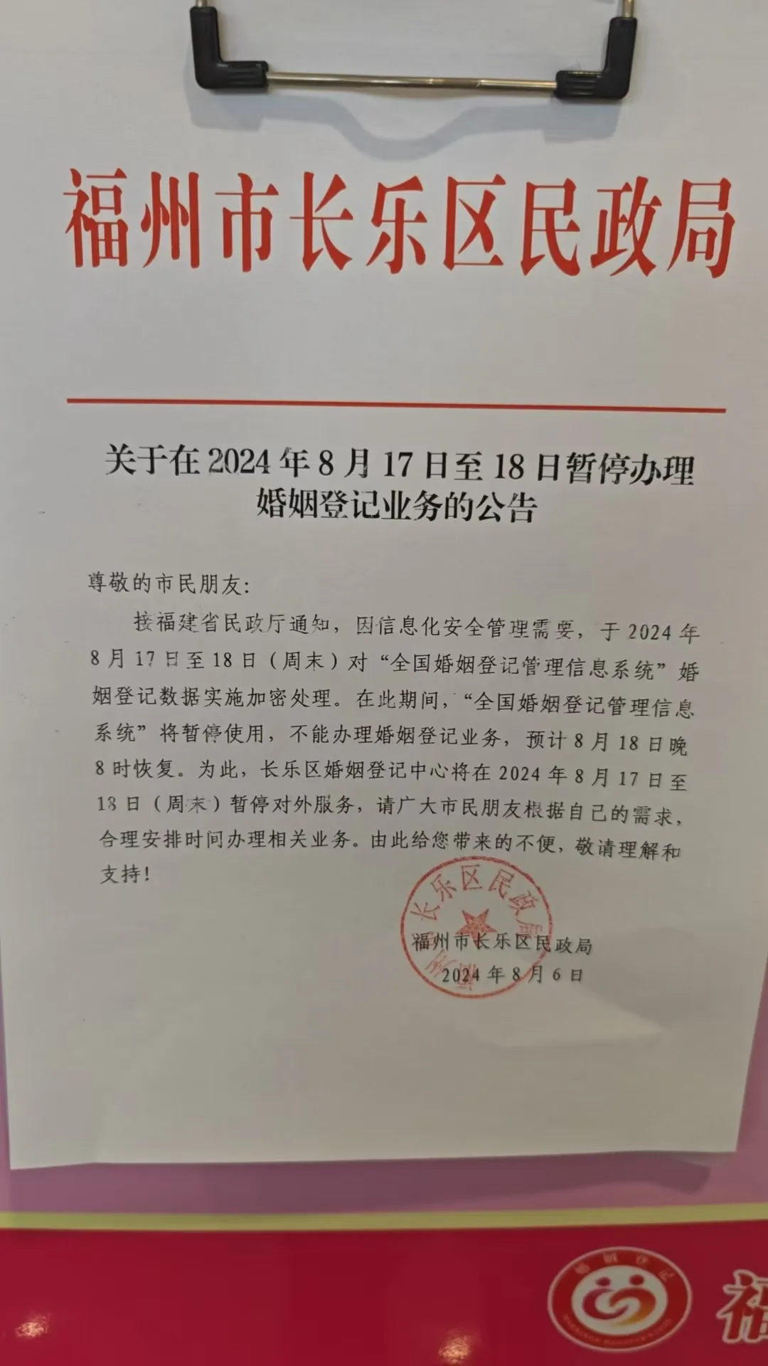 在此期间,福州各县(市)区的婚姻登记处将暂停办理婚姻登记业务,预计8月18日晚8时恢复正常。