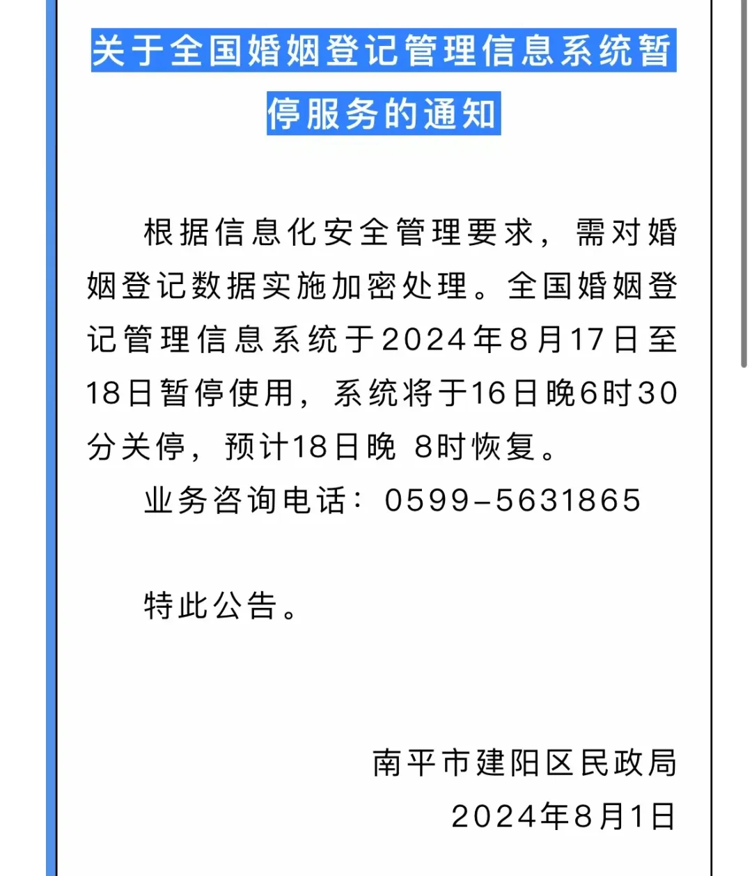 记者从福州市民政局获悉,接省民政厅通知,因信息化安全管理需要,8月17日至18日(本周六、周日)将对“全国婚姻登记管理信息系统”婚姻登记数据进行加密处理。