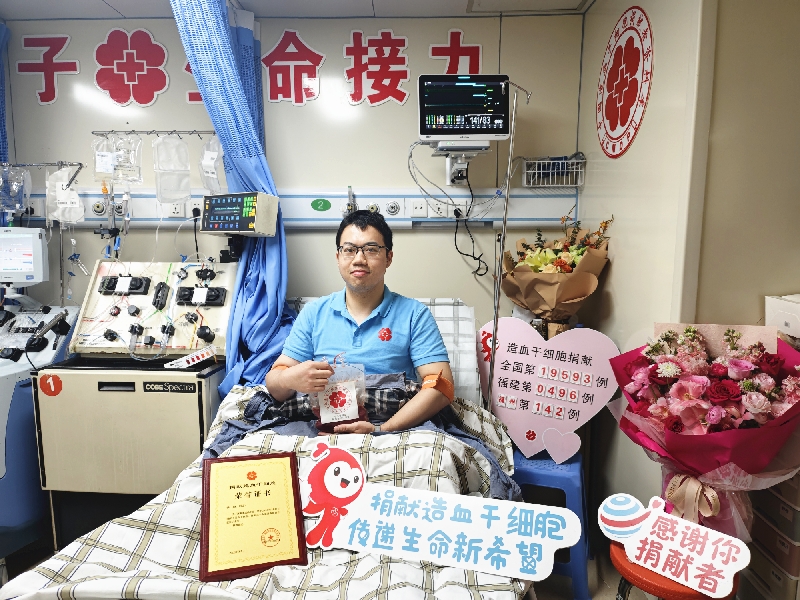 “捐献造血干细胞并不是大家固有印象中的抽骨髓,没有想象的那么可怕。就我而言,因为经常献血的缘故,觉得捐献造干和献血小板没有太大区别,只是捐献造干的准备流程繁琐一点、采集时间更长一些。”2025年3月17日同一天,在福建医科大学附属协和医院造血干细胞采集室内,福州市商务局投资促进二处副处长肖国升也顺利完成了捐献,成为福建省第497例、福州市第143例非血缘造血干细胞捐献者,他也是福州市直机关首位捐献人。2019年登记加入造血干细胞捐献者资料库后,肖国升平日里就主动向身边人宣传相关知识,现在他更想以现身说法的方式,向更多人科普和宣传造血干细胞捐献这一高尚利他的人道事业。